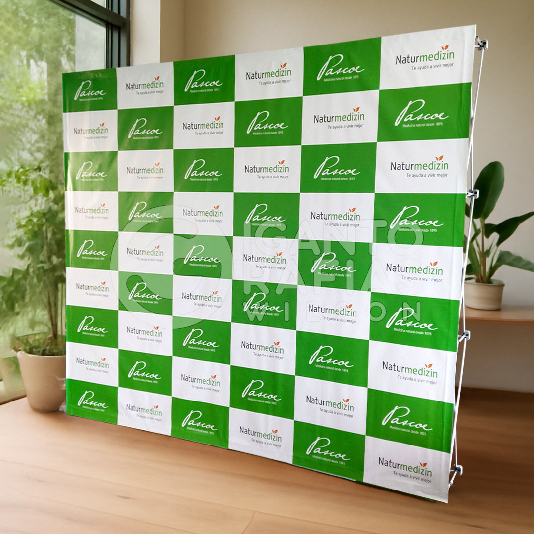 Backing publicitario con sistema de velcro elaborado para Naturmedizin. Su diseño en tonos verdes y blancos proyecta frescura, naturaleza y bienestar, reforzando la identidad de la marca en cada evento. Ideal para conferencias, ferias, lanzamientos o activaciones, este fondo ofrece máxima visibilidad y profesionalismo. Un soporte práctico y elegante que transmite confianza y cercanía con el público.