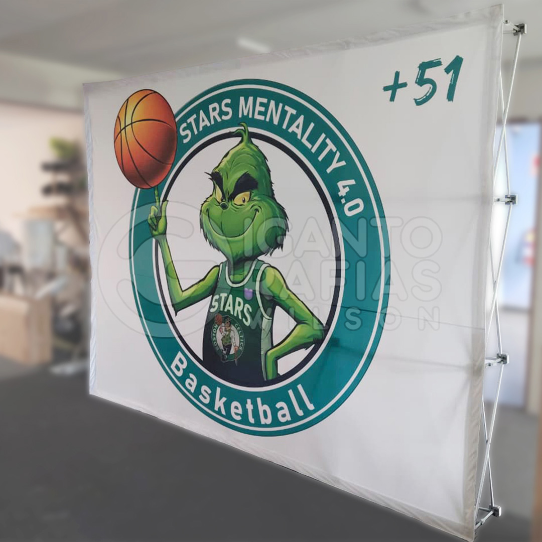 Estructura publicitaria de gran formato diseñada para ofrecer una presentación visual impactante, ordenada y altamente profesional en eventos, ferias, academias deportivas y activaciones de marca. Este backing combina una estructura de aluminio tipo araña (expandible y plegable) con una tela sublimada full color de alta definición, logrando una superficie gráfica continua, sin cortes visibles y con excelente calidad en imágenes, colores y detalles.