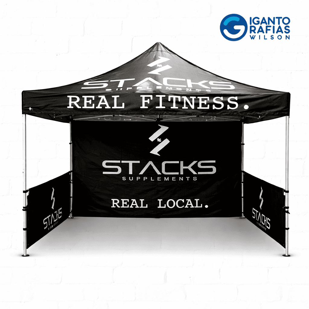 Material: Estructura metálica plegable reforzada, toldo en tela lino de alta resistencia con impresión personalizada.