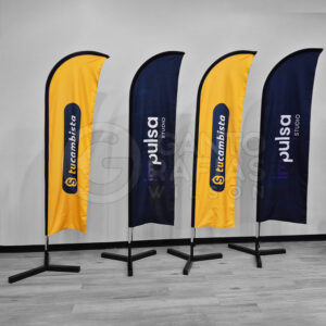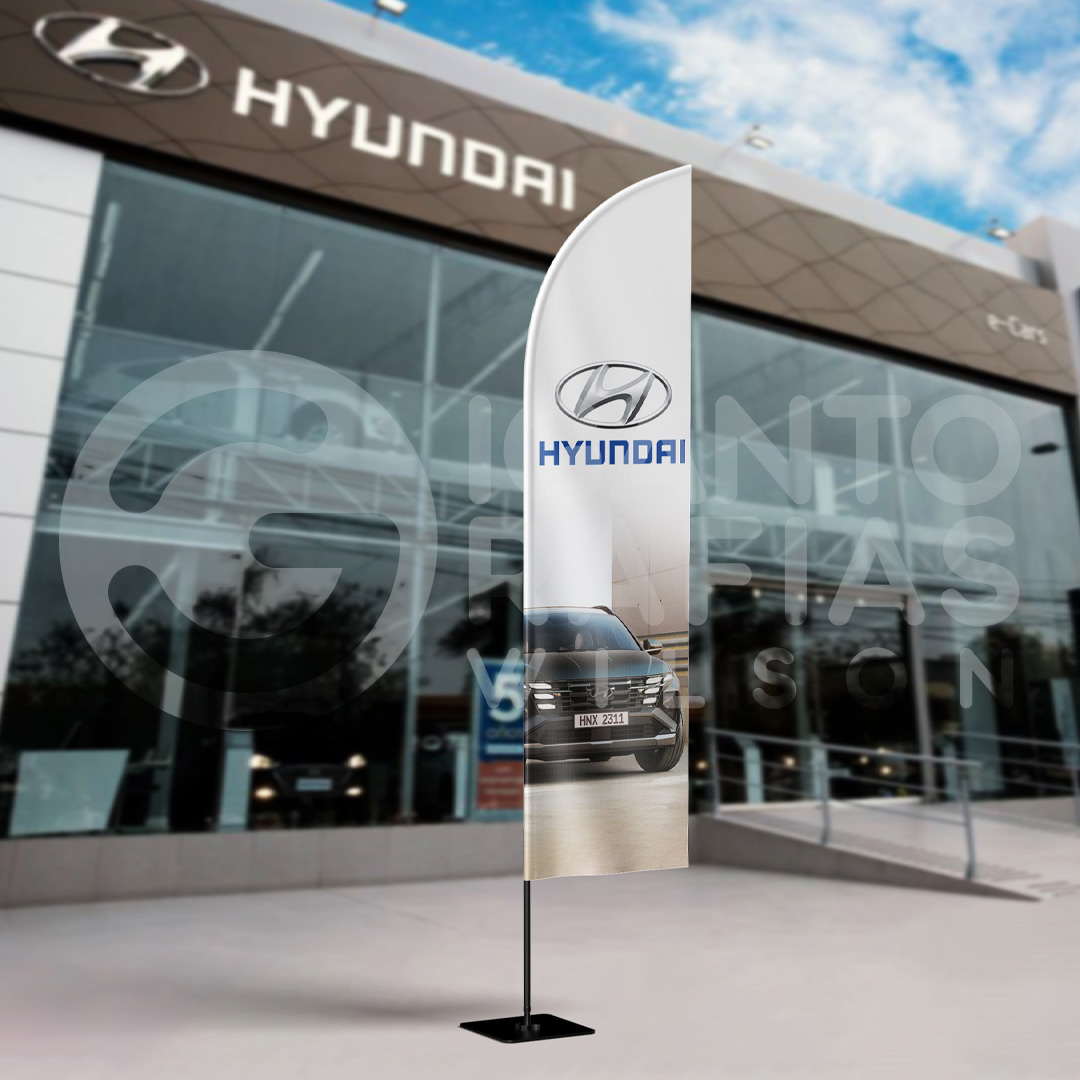 Desarrollada para la marca HYUNDAI, esta pluma presenta un diseño limpio y elegante en fondo blanco con logotipo en azul corporativo y gráfica automotriz de alto impacto en la parte inferior. Realizada por Gigantografías Wilson, combina una estética moderna con excelente visibilidad y movimiento dinámico, proyectando una imagen premium y profesional en exteriores y concesionarios.