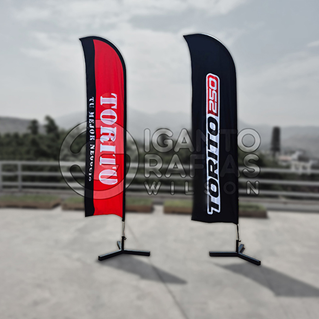 Desarrolladas para la marca Torito 250, estas plumas combinan un diseño en rojo intenso y negro con tipografía blanca de alto contraste que resalta de forma inmediata. Realizadas por Gigantografías Wilson, su formato vertical y movimiento con el viento potencian la visibilidad, logrando una presencia fuerte, dinámica y altamente llamativa en exteriores y puntos de venta.